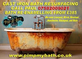 Cast iron bath enamelling, 20+ years experience in resurfacing baths. We cover Wirral, Liverpool, North Wales, Manchester, Blackpool.