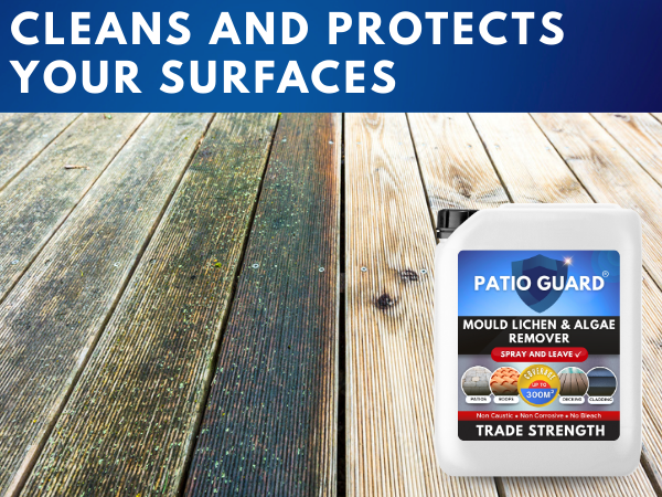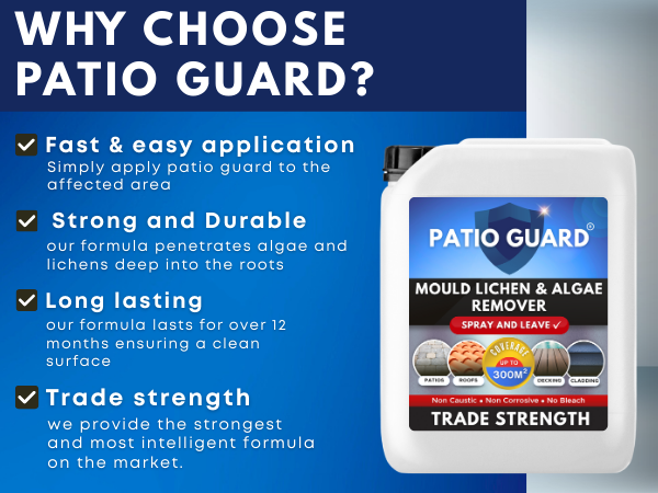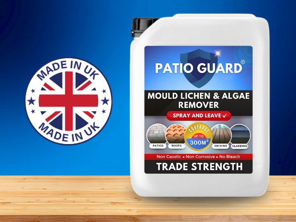 Patio Guard is recognised as a trade-strength patio cleaner and algae remover designed to eliminate algae growth from various surfaces, including patios, fences, roofs, driveways, and UPVC.