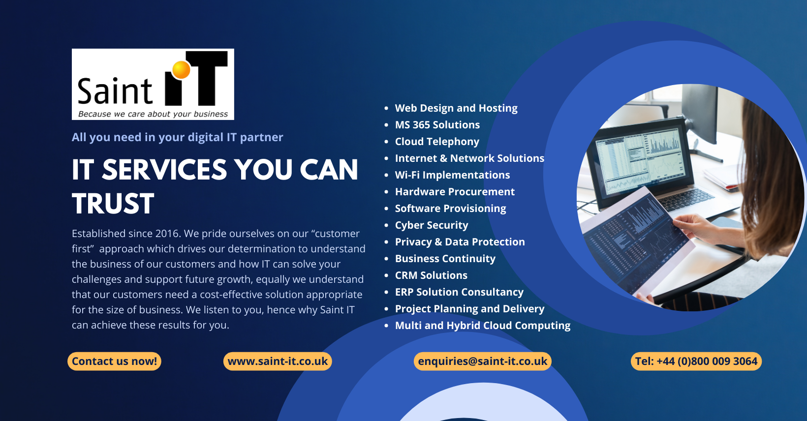 We provide Specialist IT Services for Small and Medium Enterprises, Charities and Not for Profits. From Web Design to Microsoft 365 and Multi Cloud or Hybrid Cloud. We have the Expertise for you. Contact us for Website Design and Development Services or Cloud Telephony or Wi-Fi Solutions.
