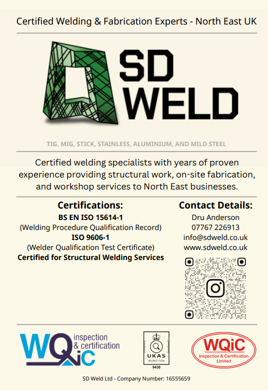 At SD Weld, we are expert welders based in Newcastle Upon Tyne, proudly serving the North East and delivering welding solutions across the UK. Our skilled team specialises in TIG welding, MIG welding, and Stick welding, with extensive experience working with stainless steel, aluminium, and mild steel.